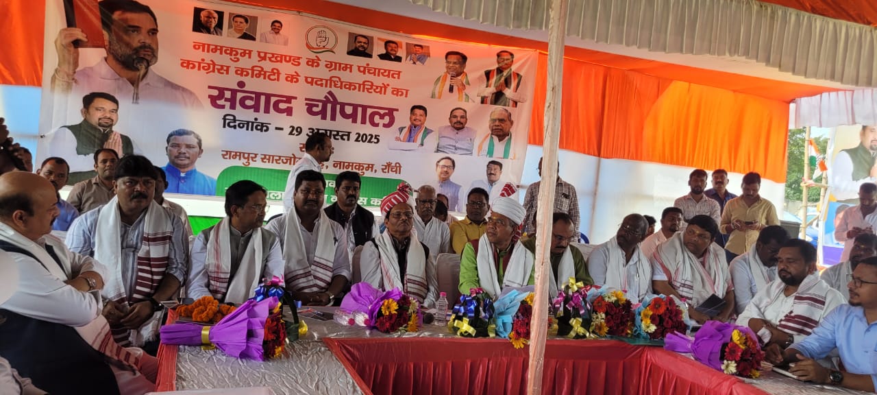 रांची/नामकुम : रांची जिला ग्रामीण कांग्रेस कमिटी के तत्वावधान में नामकुम प्रखंड के सरजोमडीह मैदान में संगठन सृजन अभियान के तहत ग्राम पंचायतों के नवनियुक्त पदाधिकारियों के साथ ‘संवाद चौपाल’ कार्यक्रम आयोजित किया गया जिसमें प्रदेश प्रभारी के. राजू ने कहा कि यदि देश के प्रत्येक ब्लॉक में कांग्रेस कार्यकर्ता सक्रिय हो जाएँ तो निश्चित ही राहुल गांधी देश के प्रधानमंत्री बनेंगे और उन्होंने पंचायत एवं ब्लॉक स्तर पर नियमित बैठक आयोजित कर संगठन को मजबूत करने पर बल दिया, वहीं प्रदेश अध्यक्ष केशव महतो कमलेश ने प्रत्येक कार्यकर्ता से अपने घर पर पार्टी का झंडा फहराने और मतदाता सूची अद्यतन करने पर जोर देते हुए भाजपा सरकार को ‘वोट चोर सरकार’ बताया, विधायक दल के नेता प्रदीप यादव ने केंद्र सरकार पर गैर भाजपा शासित राज्यों के साथ सौतेला व्यवहार करने और चुनाव आयोग की मिलीभगत से वोट चोरी करने का आरोप लगाया, जबकि विधायक दल के उपनेता राजेश कच्छप ने महँगाई, बेरोजगारी और विस्थापन जैसी समस्याओं पर चिंता जताते हुए संगठन सृजन अभियान को जनता से जुड़ने और उनके अधिकारों की लड़ाई का सशक्त माध्यम बताया; कार्यक्रम की अध्यक्षता डॉ. राकेश किरण महतो ने की और इस अवसर पर नमन विक्सल कोंगाड़ी, प्रदीप कुमार बालमुचू, बादल पत्रलेख, शहजादा अनवर, जयशंकर पाठक, सतीश पॉल मुंजनी, विनय उरांव सहित सैकड़ों कांग्रेस कार्यकर्ता मौजूद रहे।