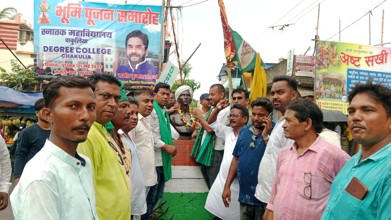 चाकुलिया नगर पंचायत के पुराना बाजार स्थित भगवान बिरसा मुंडा चौक पर भगवान बिरसा मुंडा का शहादत दिवस श्रद्धा और सम्मान के साथ मनाया गया. इस अवसर पर झामुमो कार्यकर्ताओं ने भगवान बिरसा मुंडा की प्रतिमा पर माल्यार्पण कर उन्हें नमन किया. उपस्थित लोगों ने “भगवान बिरसा मुंडा अमर रहें” के नारों के साथ उनके योगदान को याद किया. साथ ही कहा कि भगवान बिरसा मुंडा ने आदिवासी समाज को अन्याय और शोषण के खिलाफ संगठित किया और स्वतंत्रता संग्राम में महत्वपूर्ण भूमिका निभाई. उनका बलिदान झारखंड और पूरे देश के लिए प्रेरणा का स्रोत है.