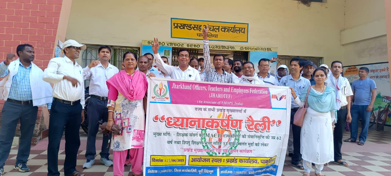 झारखंड ऑफिसर टीचर्स एंप्लॉय फेडरेशन ( झारोटेफ़) की प्रांतीय कार्यकारिणी के निर्देश पर चाकुलिया नगर पंचायत क्षेत्र स्थित अभ्यास पाठशाला मध्य विद्यालय से प्रखंड कार्यालय तक शिक्षकों व कर्मचारियों ने ध्यानाकर्षण रैली निकाली. इस दौरान रैली के माध्यम से उन्होंने अपनी 11 सूत्रीय मांगों की लेकर राज्य सरकार का ध्यान आकृष्ट किया. प्रमुख मांगों में शिक्षक संवर्ग में एमएसीपी की शुरुआत, सेवानिवृत्ति की आयु 62 वर्ष करना, केंद्रीय कर्मियों की तर्ज पर शिशु शिक्षण भत्ता देना समेत अन्य मांगे शामिल हैं. प्रखंड विकास पदाधिकारी आरती मुंडा के माध्यम से मुख्य सचिव, झारखण्ड सरकार, मुख्यमंत्री के अपर मुख्य सचिव को ज्ञापन सौंपा गया. रैली में प्रखण्ड अध्यक्ष सुनील कुमार सिंह, युधिष्ठिर प्रसाद, विलियम टोप्पो, कोषाध्यक्ष कृष्ण पद महतो, एडविन कुजूर, चंद्रशेखर तिवारी प्राण-किशोर महतो, रामकृष्ण घोष, जगदीश चंद्र महतो, दयामय मण्डल, विष्णुपद महतो, मृणाल कर, विनय दास, आद्यनाथ उरिन्दा, सुकुमार राउत, अशोक कुमार महतो, संदीप बेरा, अरुण पोद्दार, परितोष सीट, साथी तिवारी, गीता महतो, कुसुम कुमारी साव, प्रदीप कुमार माजी, बिरसा भगत, सुजय घोष, रामकृष्ण रजक, देवव्रत घोष, लिबुनस तिग्गा, विद्युत गोराई, पथिक चन्द्र दे आदि कर्मी उपस्थित थे.