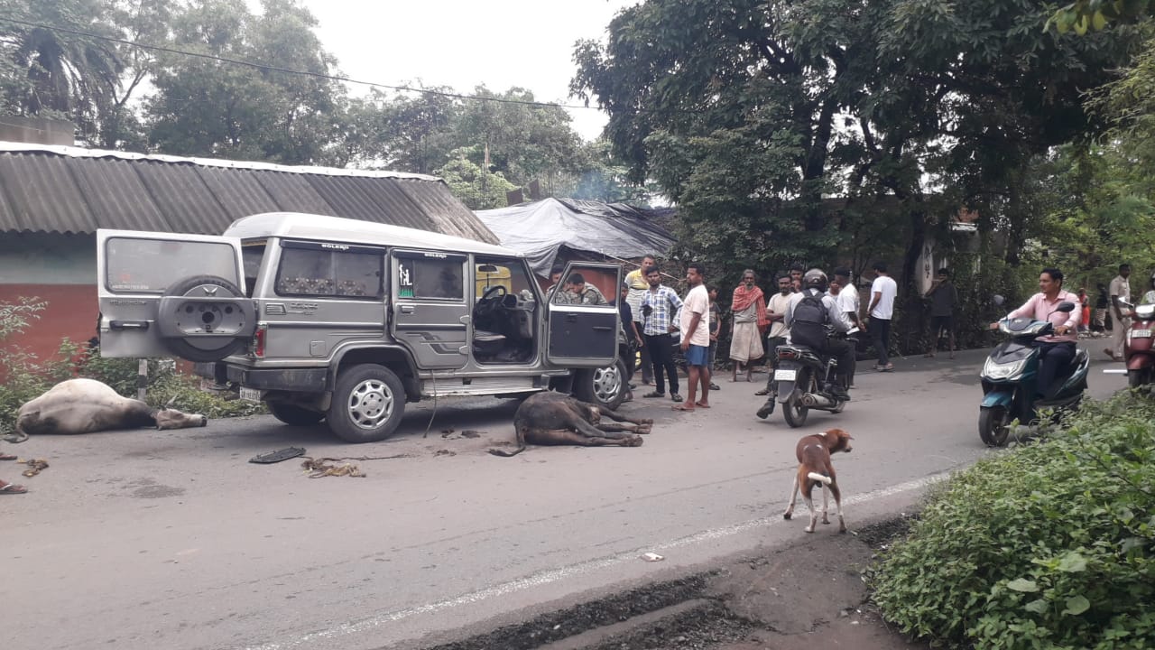 घटना शुक्रवार देर रात करीब 12 बजे की बताई जा रही है। सुबह स्थानीय लोगों ने बोलेरो से आवाज आने पर दरवाजा तोड़कर देखा तो अंदर चार बैल बंधे मिले। इनमें से दो की मौत हो चुकी थी, जबकि दो जिंदा बैलों को बाहर निकाला गया। सूचना पाकर पोटका थाना प्रभारी मनोज कुमार मुर्मू दलबल के साथ मौके पर पहुंचे। विश्व हिंदू परिषद के गौ रक्षा विभाग के सदस्य नवीन सिंह और चितरंजन गोप ने कहा कि इस मार्ग से रात के अंधेरे में छोटे वाहनों से बड़े पैमाने पर गोवंश की तस्करी होती है। ग्रामीणों ने तस्करों, वाहन मालिक और ड्राइवर पर कड़ी कार्रवाई की मांग की। थाना प्रभारी ने बताया कि जांच की जा रही है और दोषियों पर नियम के अनुसार सख्त कार्रवाई होगी। मुख्य बिंदु ओड़िशा नंबर की बोलेरो में 4 बैल, 2 की मौत गाड़ी खराब होते ही तस्कर और चालक फरार पुलिस जांच में जुटी, दोषियों पर होगी कार्रवाई