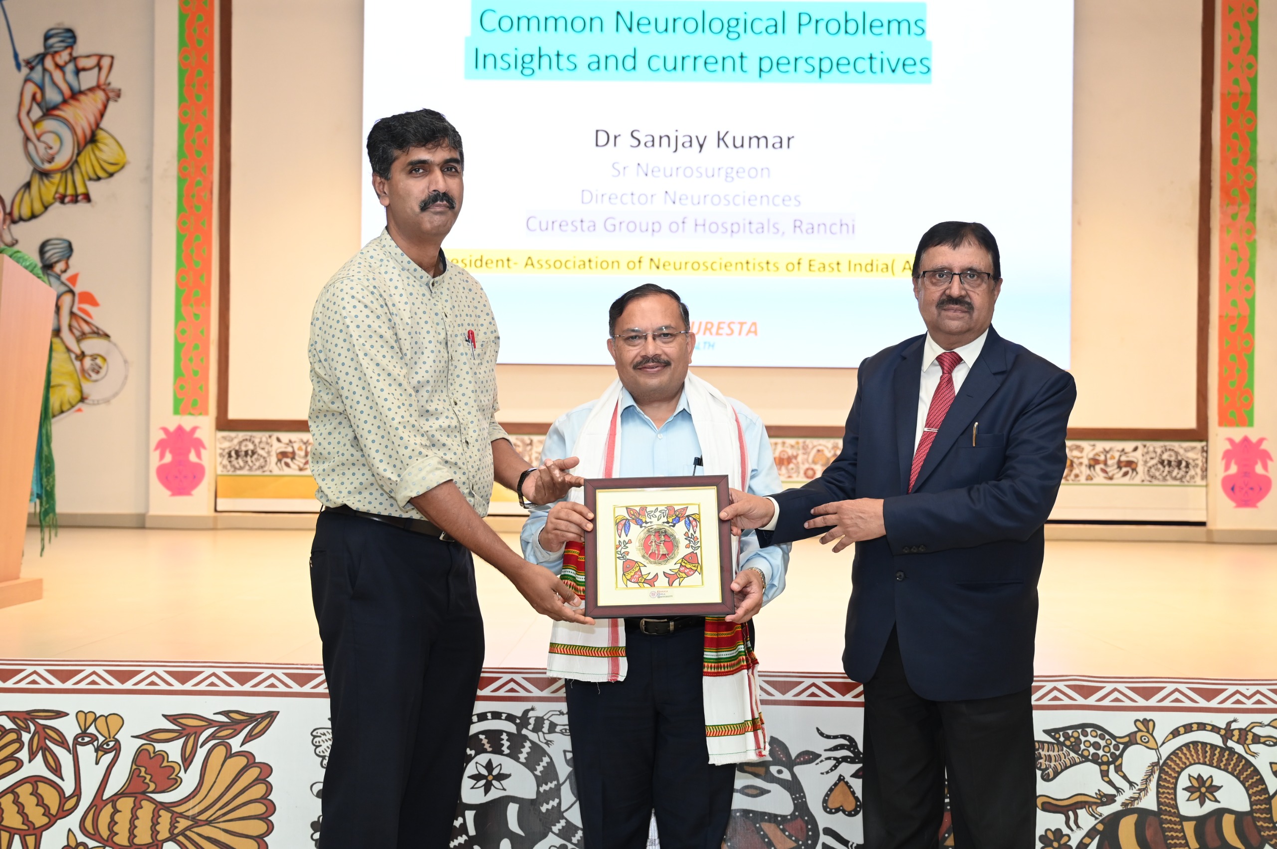 राँची । ‘ ब्रेन स्ट्रोक में गोल्डेन आवर की काफी अहमियत है। इस समयावधि में अगर मरीज को उचित इलाज मिले, तो उसकी जान बचाई जा सकती है।’ यह बातें शनिवार को प्रख्यात न्यूरो सर्जन डॉ. संजय कुमार ने कही। वे सरला बिरला विश्वविद्यालय में सरला बिरला मेमोरियल व्याख्यान के तहत ‘कॉमन इश्यूज रिलेटेड टू न्यूरोसाइंसेज’ विषय के तहत अपनी बातें रख रहे थे। कार्यक्रम का आयोजन विश्वविद्यालय के नर्सिंग विभाग ने आईक्यूएसी और इंस्टीट्यूशंस इन्नोवेशन काउंसिल के सहयोग से किया था। डॉ. संजय कुमार ने अपने संबोधन में न्यूरोलॉजिकल ट्रीटमेंट की फौरी आवश्यकता पर बल दिया। उन्होंने न्यूरोलॉजिकल ट्रीटमेंट से जुड़ी आम समस्याओं, जैसे ब्रेन स्ट्रोक, एपिलेप्सी, माइग्रेन, पार्किंसंस डिजीज, बैक पेन, सायटिका और नेक पेन के विषय में विस्तार से बताया। कार्यक्रम में बिरला एकेडमी, कोलकाता के नॉलेज रिसर्च क्यूरेटर प्रणब मुखर्जी ने “कम्युनिकेशन इकोलॉजी और पब्लिक कम्युनिकेशन स्किल्स ” विषय पर व्याख्यान दिया। उन्होंने दैनंदिन उदाहरणों के माध्यम से शिक्षकों को क्लास में बेहतर ढंग से पढ़ाने के विषय में चर्चा की। साथ ही सार्वजनिक स्थानों पर सही तरीके से बात करने पर जोर दिया। कार्यक्रम के अंत में प्रश्नोत्तर कार्यक्रम का आयोजन भी किया गया। इस अवसर पर एसबीयू के महानिदेशक प्रो गोपाल पाठक, कुलपति प्रो सी जगनाथन, डॉ. सुभानी बाड़ा, मीनल श्वेता, डॉ. नीलिमा पाठक, डॉ. संदीप कुमार समेत विवि के अन्यान्य शिक्षकगण एवं विद्यार्थी उपस्थित रहे। कार्यक्रम के आयोजन पर विवि के प्रतिकुलाधिपति बिजय कुमार दलान और राज्यसभा सांसद डॉ प्रदीप कुमार वर्मा ने हर्ष व्यक्त किया है ।