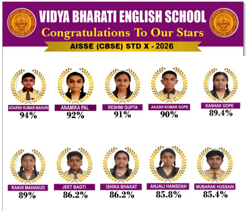 विद्या भारती इंग्लिश स्कूल हाता का सीबीएसई दसवीं मैट्रिक परीक्षा का रिजल्ट शत-प्रतिशत रहा। दसवीं कक्षा के छात्र-छात्राओं ने उत्कृष्ट प्रदर्शन कर विद्या भारती इंग्लिश स्कूल, क्षेत्र, एवं अभिभावकों का नाम रोशन किया। सीबीएसई बोर्ड द्वारा घोषित दसवीं मैट्रिक परीक्षा रिजल्ट में विद्या भारती इंग्लिश स्कूल हाता का छात्र आदर्श कुमार माहुरी 94 प्रतिशत अंक प्राप्त कर स्कूल टापर किया। जबकि छात्रा अनामिका पाल 92 प्रतिशत अंक लाकर द्वितीय टापर एवं रेशमी गुप्ता 91 प्रतिशत अंक लाकर तृतीय टापर बनी। विद्यालय के प्रिंसिपल सलीम आजाद ने बेहतर रिजल्ट प्राप्त छात्र- छात्राओं को उज्वल भविष्य की मंगल कामना किया।