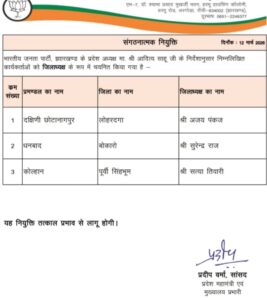खबरों के अनुसार, चुनावों को ध्यान में रखते हुए वे जमशेदपुर महानगर अध्यक्ष संजीव सिन्हा के साथ मिलकर संजीव संगठन को और मजबूत करने की रणनीति पर काम करेंगे प्रदेश महामंत्री एवं मुख्यालय प्रभारी प्रदीप वर्मा ने आधिकारिक पत्र जारी कर तीनों जिलों के अध्यक्षों की नियुक्ति की जानकारी दी है। और तत्काल प्रभावित किया गया है।
