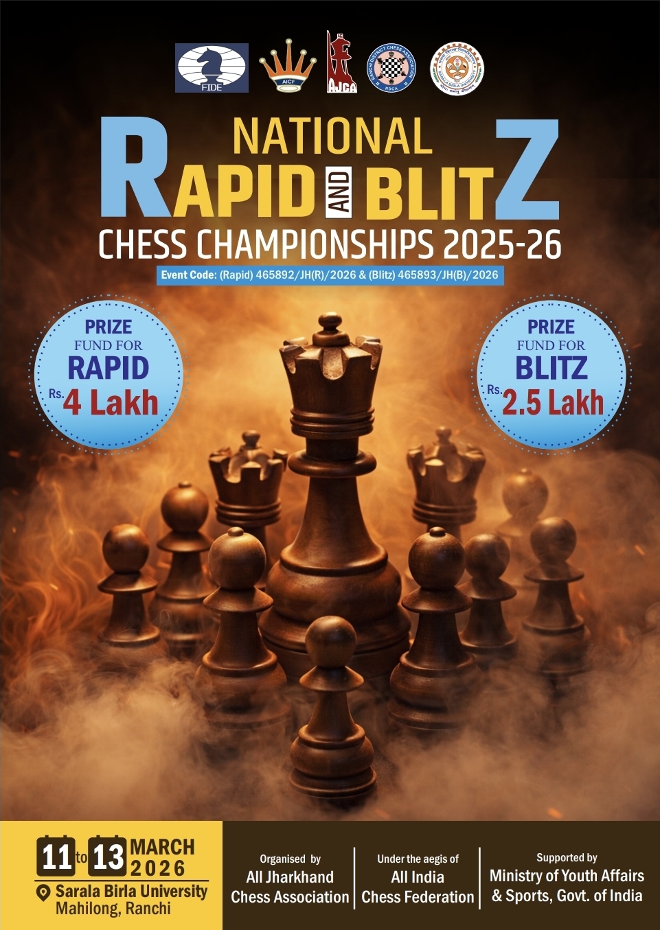 रांची में 11 से 13 मार्च तक आयोजित होगी नेशनल रैपिड एवं नेशनल ब्लिट्ज शतरंज चैंपियनशिप 2025-26