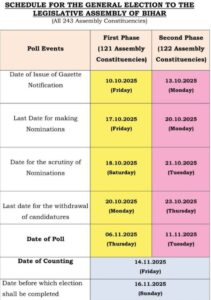 बिहार विधानसभा चुनाव 2025 को लेकर इंतजार की घड़ियां खत्म हो गईं। चुनाव आयोग ने तारीखों का ऐलान कर दिया है। दो फेज में वोटिंग होगी। पहले फेज में 6 नवंबर को और दूसरे फेज में 11 नवंबर को वोटिंग होगी। 14 नवंबर को मतों की गिनती की जाएगी। 16 नवंबर तक चुनावी प्रक्रिया जारी रहेगी। बिहार विधानसभा चुनाव 2025 से जुड़ी कुछ महत्वपूर्ण बातें निम्न है।