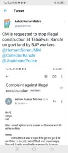 वही अशोक मिश्रा ने बताया कि मुझे शाम को जानकारी हुई कि कल 11 अक्टुबर को नामकुम प्रखण्ड के टाटीसिलवे थाना के समीप सरकारी भूमि पर समाधान केंद्र के नाम पर भाजपा कार्यालय का शिलान्यास सांसद संजय सेठ के द्वारा किया जाना है । कांग्रेस पार्टी भाजपा के कार्यकर्त्ता द्वारा सरकारी भूमि पर कब्जा की साजिश का विरोध करता है । वही अशोक मिश्रा ने मुख्यमंत्री झारखण्ड सरकार ,उपायुक्त रांची, अनुमंडल पदाधिकारी नामकुम, थाना प्रभारी टाटीसिलवे को सोशल साईड के जरीय आवेदन दिया है जिसमें सरकारी भूमि पर समाधान केन्द्र के निर्माण का विरोध जताया है और इस कार्य में सम्मलित सभी लोगों पर न्याय संगत कार्रवाही की मांग की है ।