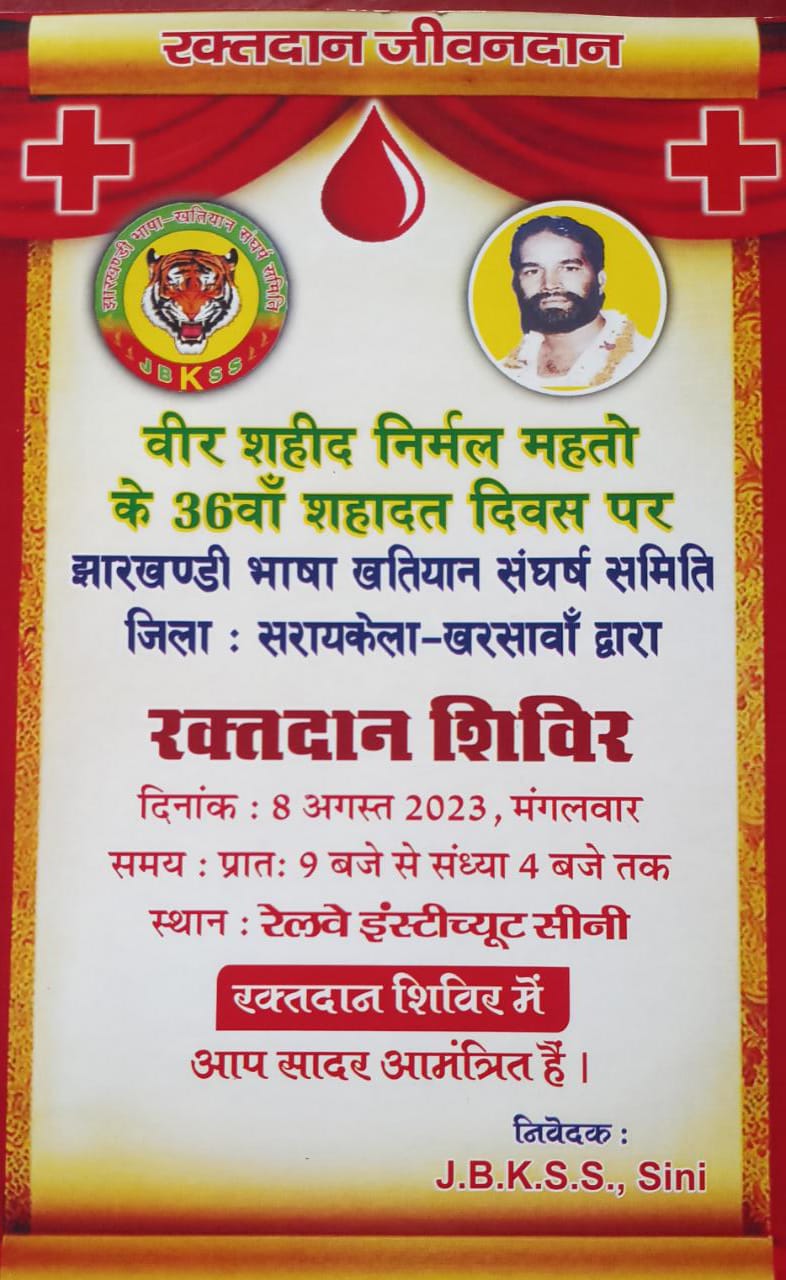 सरायकेला। रक्तदान जीवनदान के मूल मंत्र के साथ शहीद निर्मल महतो के 36वें शहादत दिवस पर आगामी 8 अगस्त को स्वैच्छिक रक्तदान शिविर का आयोजन किया जाएगा। झारखंडी भाषा खतियान संघर्ष समिति सरायकेला-खरसावां के तत्वावधान उक्त स्वैच्छिक रक्तदान शिविर का आयोजन सीनी स्थित रेलवे इंस्टिट्यूट में किया जाएगा।