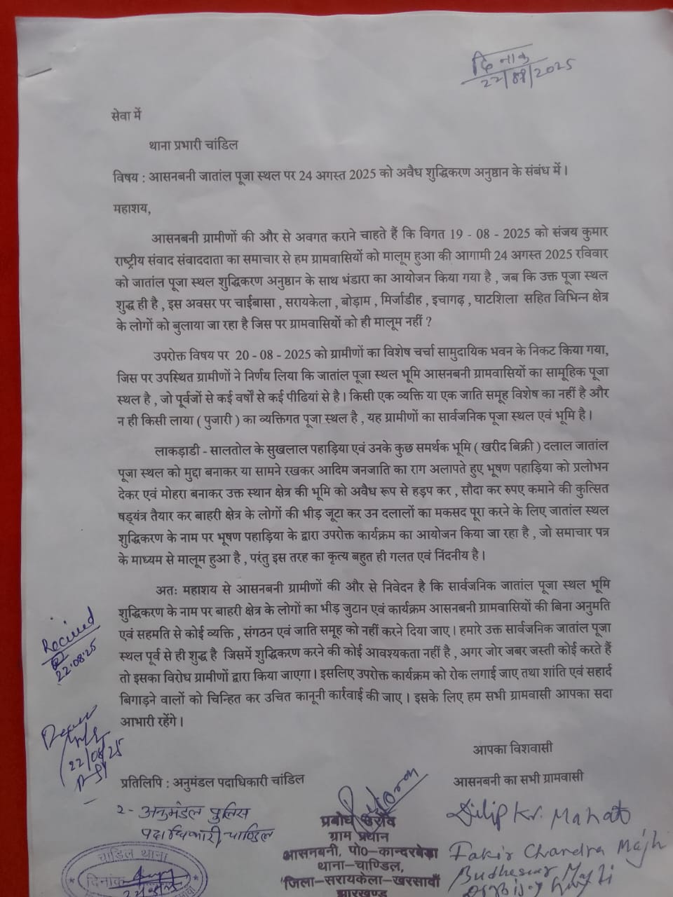 चांडिल : चांडिल प्रखंड के आसनबनी गांव के ग्रामीणों ने जातांल पूजा स्थल पर प्रस्तावित शुद्धिकरण अनुष्ठान और भंडारा कार्यक्रम को अवैध बताते हुए उस पर रोक लगाने की मांग की है। इस संबंध में ग्रामीणों ने थाना प्रभारी को लिखित शिकायत सौंपी है, जिसकी प्रतिलिपि अनुमंडल पदाधिकारी और अनुमंडल पुलिस पदाधिकारी को भी दी गई है। ग्रामीणों के मुताबिक, 24 अगस्त 2025 (रविवार) को जातांल पूजा स्थल पर बाहरी लोगों द्वारा शुद्धिकरण अनुष्ठान और भंडारा आयोजित करने की तैयारी की जा रही है। ग्रामीणों का कहना है कि यह स्थल वर्षों से सार्वजनिक पूजा स्थल है और पहले से ही शुद्ध है। यह किसी एक व्यक्ति या जाति समूह की निजी संपत्ति नहीं है। 20 अगस्त को सामुदायिक भवन में हुई बैठक में ग्रामीणों ने सर्वसम्मति से निर्णय लिया कि बाहरी संगठन या व्यक्ति द्वारा जबरन अनुष्ठान करना गलत है। आरोप लगाया गया कि कुछ भूमि खरीद–बिक्री एजेंट इस स्थल को विवादित कर कब्जे की साजिश रच रहे हैं। ग्रामीणों ने प्रशासन से मांग की है कि ऐसी गतिविधियों पर रोक लगाई जाए और शांति भंग करने वालों के खिलाफ सख्त कार्रवाई की जाए। उन्होंने चेतावनी दी कि यदि जबरन अनुष्ठान किया गया तो वे विरोध करेंगे।